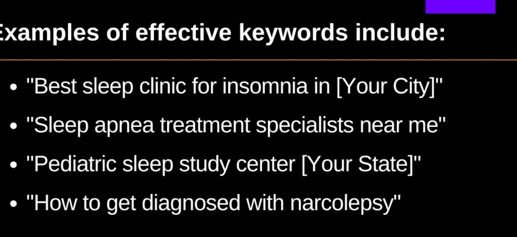 Think beyond broad terms like “sleep clinic.” More specific long-tail keywords often have less competition and attract highly qualified traffic.